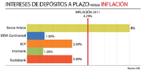 El dato más contundente surge cuando se compara la inflación acumulada con el rendimiento de los depósitos. Por ejemplo, en 2011, el Índice de Precios al Consumidor (IPC) en el Perú registró un aumento del 4.74%. Es decir, salvo en el caso del Banco Azteca, si una persona depositó en cualquiera de las cuatro empresas más importantes, al cabo de un año terminó por perder dinero, puesto que el interés fue menor que la depreciación de la moneda.