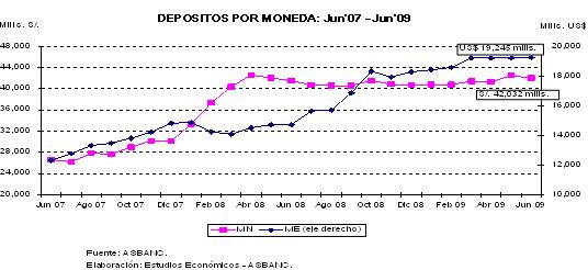 Según el tipo de moneda en que están denominados, los Depósitos en Moneda Nacional totalizaron S/. 42,032 mills. al término del primer semestre del 2009, cifra menor en S/. 450 mills. (-1.06%) en comparación con mayo 2009. De otro lado, los Depósitos en Moneda Extranjera ascendieron a US$ 19,245 mills., monto mayor en US$ 30 millones (0.16%) con relación a mayo 2009.