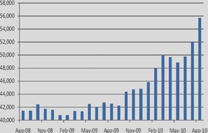 Mientras tanto, los depósitos en moneda extranjera llegaron en agosto a US$ 18,524 millones, monto menor en US$ 301 millones (-1.60%) con relación al julio de 2010, y en US$ 780 millones (-4.04%) respecto a agosto de 2009. A pesar de la reducción de agosto, los depósitos en esta moneda muestran una tendencia creciente en lo que va del 2010. Cabe señalar que la marcada caída en los depósitos en moneda extranjera en enero 2010 respondió principalmente a una reclasificación de las cuentas pasivas.