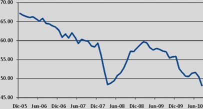 La participación de los depósitos en moneda extranjera en relación al total continuó cayendo y en agosto llegó a un nuevo mínimo histórico, 48.18%, cifra menor en 2.36 puntos porcentuales con relación al mes anterior, y menor en 9.05 puntos porcentuales frente a agosto de 2009. Esta reducción se da por el mayor crecimiento de los depósitos en moneda nacional, en un contexto de fortalecimiento continuo de la moneda local.