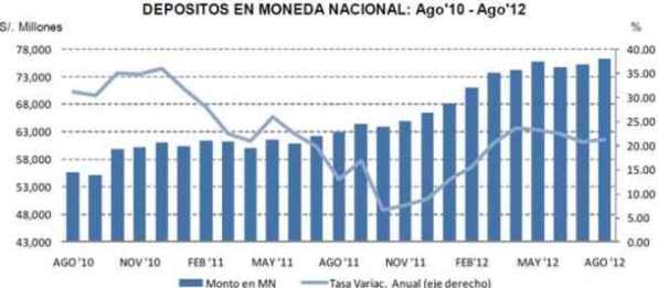 Así, los Depósitos en Moneda Nacional del sistema bancario reportaron un alza en agosto y alcanzaron un saldo de S/. 76,297 millones, monto mayor en S/. 1,066 millones (1.42%) frente a julio 2012, y en S/. 13,379 millones (21.26%) respecto a agosto 2011. El incremento mensual en agosto respondió al avance de los depósitos a la vista y plazo de personas jurídicas (con y sin fin de lucro).