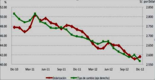 La dolarización de los D\depósitos presentó un aumento en diciembre último, debido a la evolución opuesta de los depósitos según moneda explicada anteriormente, y llegó a 41.64%. Este nivel fue mayor en 0.49 puntos porcentuales respecto a noviembre 2012, y menor en 5.68 puntos porcentuales frente a diciembre 2011. No obstante lo observado en diciembre pasado, se espera que en los próximos meses se retome la tendencia decreciente en la dolarización.