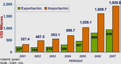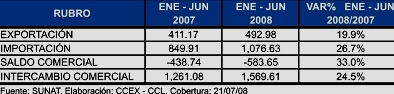 Además, entre aquellas que han experimentado algún incremento, con relación al mismo periodo del año 2007 destacan algunos insumos y confecciones de la industria textil, los productos químicos, los alimentos como las preparaciones o conservas de pescado, el orégano, la caballa y el frijol castilla, así como algunos insumos orgánicos (carmín de cochinilla y tara en polvo).