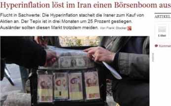 Asimismo, comparando la situación actual de los accionistas iraníes en la bolsa de Teherán con los accionistas alemanes en las bolsas del país europeo en 1923, uno de los peores años económicos del país germano por la elevada inflación, el diario alemán añade que “los alemanes que habían invertido en la bolsa formaron parte de los pocos alemanes que consiguieron superar la mala situación económica que atravesaba el país en aquel entonces”.