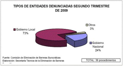 Según el portal del INDECOPI, durante el segundo trimestre del 2009 el 22% de las barreras burocráticas corresponden a restricciones a la instalación de infraestructura de servicios públicos, el 17% corresponde a restricciones a la prestación de servicios de transporte de pasajeros, 14% versan sobre licencias de funcionamiento, el 14% sobre restricciones tributarias al libre tránsito, 9% sobe anuncios de publicidad, 14% otros.