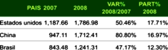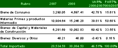 Por su parte, las importaciones de este tipo de bienes provenientes de Brasil sumaron los US$ 1,241 millones, registrando una expansión de 47.2% respecto al 2007. El 12.30% de este tipo de productos provino del país carioca.