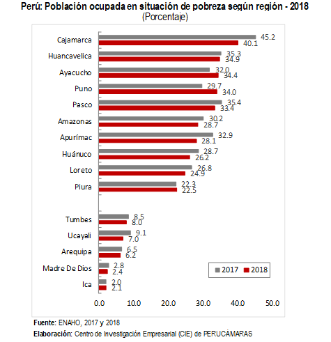 Por regiones, Cajamarca registró la tasa más alta de ocupados en situación de pobreza en el país (40,1%) en el 2018. Le siguen Huancavelica (34,9%), Ayacucho (34,4%), Puno (34%) y Pasco (33,4%).