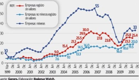 Hace pocos días un informe de la consultora Gerens nos informó que la rentabilidad promedio de las empresas inscritas en la Bolsa de Valores de Lima (BVL) fue de 25,5% en el 2010. Añade Gerens que la rentabilidad de las empresas mineras fue aún mayor, llegando a 33,3% en el 2010.