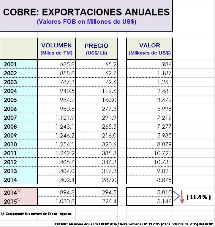 Para ello, presentamos dos cuadros uno referido “Cobre: Exportaciones Anuales 2001 – 2014 (agosto)” y el Ranking de la Producción de Concentrados de Cobre Según Empresas 2015/2014 a setiembre” según la estadística del Ministerio de Energía y Minas a través de la Dirección General de Minería (DGM).