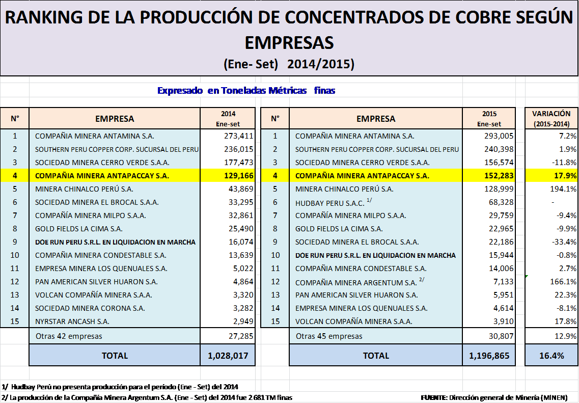 En resumen, sino fuera por la entrada en operaciones de los nuevos proyectos como el de Toromocho con Mra. Chinalco en Junín y Constancia con la canadiense Mra. Hudbay Perú SAC en el Cuzco, la producción cuprífera hubiese permanecido casi constante en el acumulado enero/ setiembre del 2015 como se podrá observar en el cuadro respectivo en relación a la producción de concentrados de cobre por empresas al mes de setiembre.