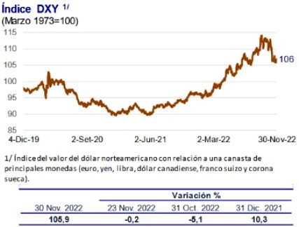 En el periodo de análisis, el índice del dólar bajó 0,2 por ciento en un contexto de expectativas de ajuste menos brusco de la tasa de interés en Estados Unidos, informa el Banco Central de Reserva del Perú (BCRP).
