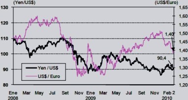Al 2 de febrero, las cotizaciones fueron de 1,40 dólares por euro y 90,4 yenes por dólar.