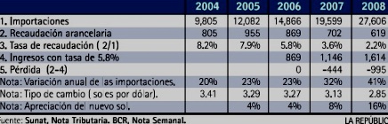 Pero para estimar la pérdida real, hay que multiplicar las importaciones del 2008 por la tasa de recaudación del 2006 (5.8%). Así, la recaudación en el 2008 hubiera sido de US$ 1,614 millones y no solo de US$ 619 millones, como ahora (ver cuadro). La diferencia es de US$ 995 millones, que equivale a los S/. 3,000 millones que menciona la Dra. Ortiz. No hay error, entonces, en sus cifras.
