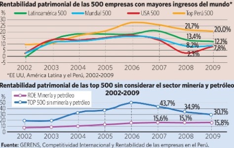 Según Gerens, en el Perú la rentabilidad promedio en el 2009 fue de 20%, lo que superó largamente al promedio mundial, norteamericano y latinoamericano (ver gráfico 1). Nótese también que desde el 2005 la rentabilidad promedio peruana supera el 20%, lo que quiere decir que en ese lapso —en promedio— las Top 500 ya recuperaron todo su patrimonio.