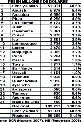 Las contradicciones que se observan en el PBI de las regiones son impresionantes. En un extremo, la economía de Lima y Callao (puesto 1) es la octava economía de América Latina y El Caribe, superando a la de Ecuador, siendo dos veces la de Costa Rica, tres veces la de Panamá, cuatro veces la de Bolivia y cinco veces la de Honduras.