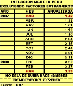 Los precios siguen subiendo. A marzo de 2008, la inflación anualizada de las familias, excluyendo factores extranjeros, es de 3.59% e incluyendo factores extranjeros es de 5.55%.