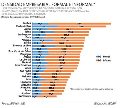 El IEDEP afirma que a pesar de excluir en las estimaciones las unidades empresariales agropecuarias, los ratios de DE informal en todas las regiones supera al formal. En esta lista, además de Tumbes, Madre de Dios y Ucayali, que ya fueron mencionadas, se encuentran Tacna (153,8), Lambayeque (189,8) y Piura (183,9). Entre las regiones con menos concentración de negocios informales figuran Huancavelica (87,0), Apurímac (90,1) y Pasco (97,6).