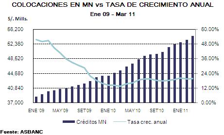 Al cierre de marzo 2011, las Colocaciones Totales otorgadas por el sistema bancario privado peruano, expresadas en Nuevos Soles, ascendieron a 113,659 millones, y registraron aumentos mensuales e interanuales tanto en soles como en dólares.