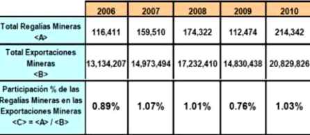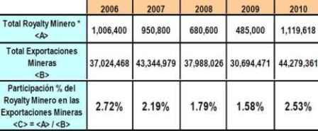 La evolución de las regalías en el Perú no ha sido significativa como se puede observar en el cuadro respectivo, representando el 1% de los ingresos de exportación entre el 2006 al 2010. El nivel más elevado sucedió en el 2010 cuando sumaron los 214 millones de dólares, monto superior a los 174 millones alcanzados en el 2008, hasta entonces, el mejor año.
