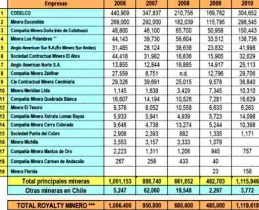 Por ello, en el cuadro de “Chile: Pago de las Empresas Afectas al Impuesto Específico a la Actividad Minera (Royalty)” (cuadro 3) en el período 2006 al 2010, resulta evidente la importancia fundamental que tiene la estatal Codelco en el abono de las regalías que en dicho país se denominan “royalty”. Así en el 2006 frente a un royalty total de mil millones de dólares Codelco participó con 440 millones y en el 2010 de un total de 1,116 millones contribuyó con 305 millones de dólares.