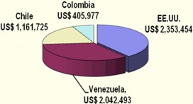 Sobre los destinos, el Sistema de Inteligencia Comercial ADEX DATA TRADE, señala que con una recuperación de 6% respecto al 2009, Estados Unidos se ubicó como líder en el ranking, con pedidos por US$ 2.3 millones. Le siguió Venezuela (US$ 2 millones), Chile (US$ 1.1 millones) y Colombia (US$ 405 mil).