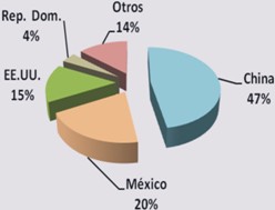 En lo que respecta a los destinos que en el 2010 sumaron un total de 77, tenemos que China, México y Estados Unidos representan el 82.3% de participación, con US$ 79.3 millones, US$ 33. 7 millones y el tercero US$ 24.9 millones, respectivamente.