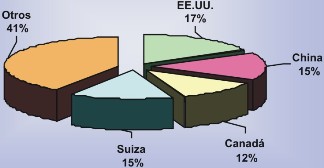 Le sigue Canadá US$ 282.8 millones, Suiza US$ 240.9 millones, Japón y Chile, seguido de Corea del Sur, Italia, Colombia, Brasil, Países Bajos, Ecuador, entre otros. En enero nuestros productos llegaron a 120 países. Los que registraron los más altos índices de crecimiento son Suecia con 2545%, Singapur con 1562%, Tunicia 1154%, Hungría 878%, Panamá 621% y Egipto con 613%.
