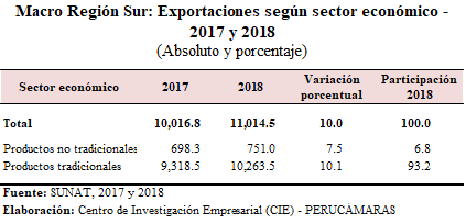 Los envíos al exterior de la Macro Región Sur crecieron 10% en el 2018, al sumar US$ 11,014.5 millones, según un informe del Centro de Investigación Empresarial (CIE) de PERUCÁMARAS.
