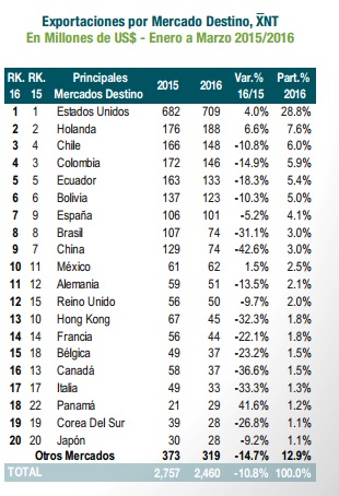 Por otro lado, al cierre del primer trimestre del año, Estados Unidos se mostró como el principal mercado destino de las exportaciones no tradicionales peruanas. Los envíos de enero a marzo crecieron 4%. Registraron un total de US$709 millones en comparación a lo obtenido en enero a marzo de 2015 (US$682 millones).