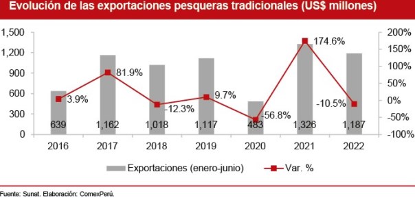 A nivel desagregado, las exportaciones pesqueras tradicionales y no tradicionales fueron US$ 1,187 millones (-10.5%) y US$ 847 millones (+4.6%), respectivamente. Entre los productos tradicionales, se exportaron US$ 968 millones en harina de pescado y US$ 219 millones en aceite de pescado, con lo que se evidenció una caída del 7.3% y el 22.2%, respectivamente, en comparación con el mismo periodo de 2021. En esa línea, entre los productos no tradicionales, destacaron las exportaciones de productos congelados (US$ 174 millones; -18.3%); hígados, huevas y lechas (US$ 75 millones; +68.3%); moluscos (US$ 55 millones; -41.6%) y atunes (US$ 16 millones; -6.7%).