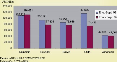 La crisis no solo afecta a EE.UU., los países de la Unión Europea y el Asia, sino también a los del área andina, es así que entre enero y septiembre, si bien los volúmenes de los productos del subsector químicos que tienen a nuestros vecinos como sus principales destinos, mantuvieron un crecimiento de 1.1%, el monto FOB cayó en 21.6%, informó la Asociación de Exportadores (ADEX).