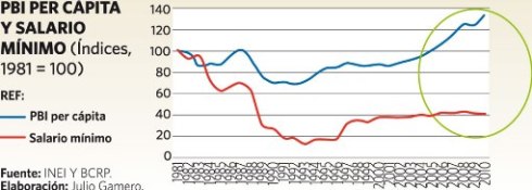 En los últimos 5 años el salario mínimo fue aumentado en tres oportunidades: en enero del 2006 subió de 460 a 500 soles mensuales; en enero del 2008, subió a 550 soles mensuales y en febrero del 2011 subió a S/. 600/mes. En total, el salario mínimo ha aumentado en 30%, bastante menos que el PBI en el mismo periodo.