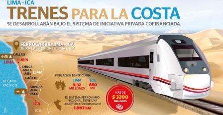 La calidad de vida de más de 10 millones de usuarios de Lima, Cañete, Chincha, Pisco e Ica; está próxima a mejorar con la construcción del ferrocarril que unirá las regiones de Lima e Ica.