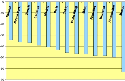 Sólo Moscú experimentó un alza, pero su índice desde enero experimenta una caída más fuerte que las de las bolsas europeas, asiáticas o americanas, pues supera el 60%, como se ve en el cuadro. Las operaciones bursátiles se mantienen suspendidas en Moscú.