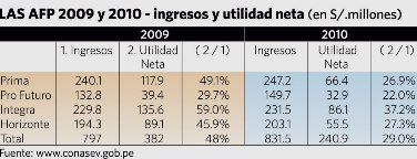 En el 2009 las AFP tuvieron ingresos por S/. 797 millones, que provinieron de las comisiones que les cobran a los futuros pensionistas. Ese mismo año las utilidades de las AFP ascendieron a S/. 382 millones. Esto equivale a decir que por cada 100 soles de ingresos obtuvieron 48 soles de utilidades.