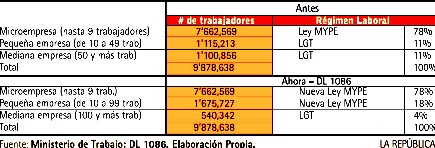 La cuestión es que para realizar esa reforma no se tenía que degradar los derechos de cerca de 1’670,000 trabajadores que se regían por el DL 728 (Ley General del Trabajo). En efecto, el DL 1086 sube la definición de pequeña empresa de 10 a 99 trabajadores y dispone que esta ya no se rija por la LGT, sino por el DL 1086, que recorta la CTS y las vacaciones.