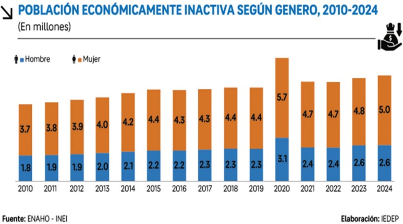 Según el Instituto de Economía y Desarrollo Empresarial (IEDEP) de la Cámara de Comercio de Lima (CCL), la Población Económicamente Inactiva (PEI) -conformada por personas que no trabajan ni buscan empleo- ha mantenido un crecimiento sostenido en los últimos 14 años, pues pasó de 5,5 millones en 2010 a 7,6 millones de peruanos en 2024, con mayor predominancia en mujeres.