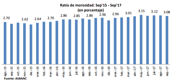 El índice de morosidad de los créditos concedidos por las entidades bancarias privadas retrocedió en setiembre último a 3.08%. De esta forma, observamos una disminución de 0.03 puntos porcentuales respecto a agosto pasado. Cabe precisar que con la caída anotada en el noveno mes, la morosidad acumuló dos descensos consecutivos, situación que no se veía desde el 2015 cuando en noviembre y diciembre de dicho año también retrocedió sucesivamente.