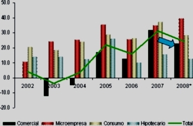 “Este dinamismo del crédito se ha reflejado también en una menor participación del flujo del crédito medido como porcentaje del PBI, que al primer semestre del 2008 representa 8.9% del PBI, 7.3 puntos por debajo de lo registrado en el primer semestre del 2007”, explicó el Dr. César Peñaranda Castañeda.