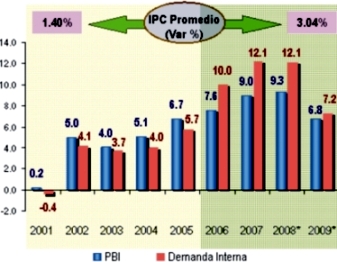 En ese sentido, detalló que mientras que en el año 2006 el PBI creció en 7.6%, la demanda interna creció en 10.0%; situación similar a la del año 2007, cuando el PBI aumentó en 9.0% y la demanda interna lo hizo en 12.1%. Este año el PBI cerraría con una expansión de 9.3%, mientras que la demanda interna lo haría en 12.1%.