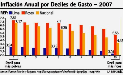 Pero lo más importante y novedoso del estudio de M y S es que demuestra que, para los pobres, la inflación es mucho mayor que para los ricos, debido a que gastan una mayor proporción de sus ingresos en Alimentos. Así, para el Decil 1 (el más pobre) la inflación nacional del 2007 fue 7.17%, mientras que para el Decil 10 (el más rico), la inflación fue solo 4.48%. La diferencia entre ambas inflaciones es nada menos que 60%.