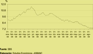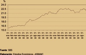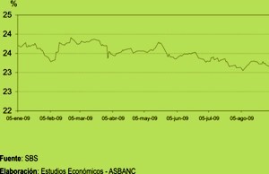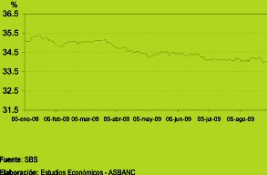 La tasa en soles descendió en 0.66 puntos porcentuales, de 8.10% a 7.44%, mientras que la tasa en dólares cayó en 0.15 puntos porcentuales, de 7.52% a 7.37%. Las reducciones descritas responden principalmente a las menores tasas a las que vienen accediendo las empresas, en particular las corporativas. La comparación se refiere en todos los casos a la diferencia entre la tasa registrada el último día de agosto respecto de la del cierre de julio.