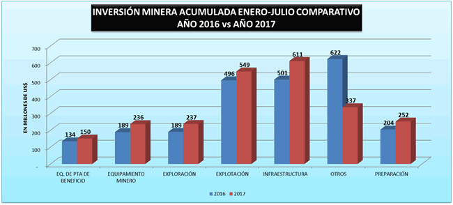 Cabe resaltar que las inversiones en el rubro de infraestructura alcanzaron los US$ 611 millones, representando el 26% del total de las inversiones mineras ejecutadas entre enero y julio del presente año.