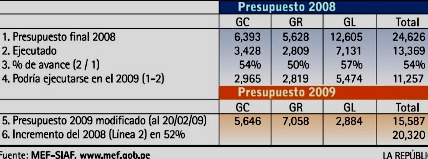 Así las cosas, ¿cuál es la cifra que aumentará en 52%, según Carranza? ¿Serán los S/. 13,369 millones ejecutados a diciembre del 2008? ¿Será el Presupuesto del 2008, con la adición de las inversiones que se realicen en el 2009? ¿Será el Presupuesto del 2009 de S/. 15,587 millones, aumentado en 52%? No está claro, pero lo más probable es que sean los S/. 13,367 millones del 2008, lo que, aumentado en 52% nos da la cifra de S/. 20,300 millones, lo que incluirá parte del 2008 (que se haga en el 2009) y las inversiones del 2009.