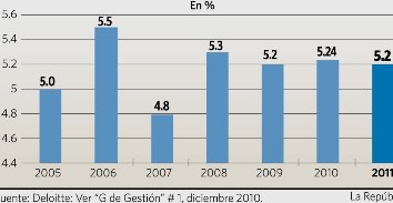 | Incremento anual, sueldo promedio de ejecutivos 2005-2011 |