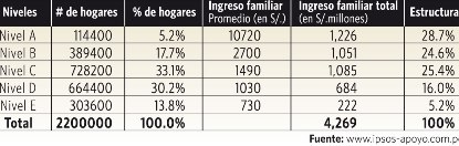 Por eso, es clave saber cuántos son, cuánto ganan y cuáles son las necesidades de estos sectores. Es lo que hace Ipsos-Apoyo en un estudio reciente de Lima Metropolitana titulado “Perfil de los hogares según nivel socio-económico” (www.Ipsos-apoyo.com.pe), basado en entrevistas a 1,010 jefes de hogar.