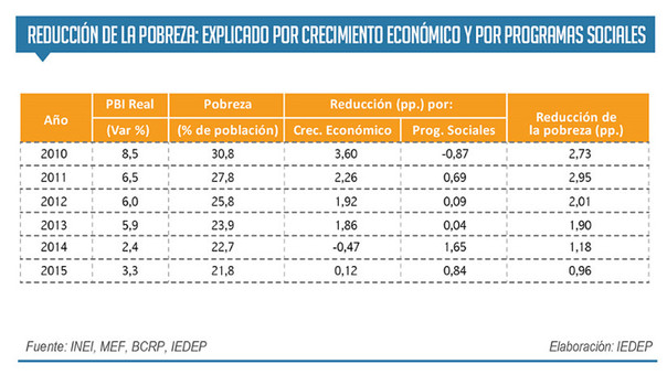 En tanto, en el 2015 la reducción de la pobreza en 0,96 p.p se explica por el crecimiento de 3,3% del PBI que redujo la pobreza en 0,12 p.p, aunque los programas sociales tuvieron un mayor impacto (0.86 p.p.)