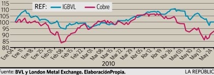 La estrecha correlación que existe entre los precios de los commodities y el IGBVL se explica porque las acciones de las empresas mineras explican el 60% del total. Se aprecia, sin embargo, que en febrero y en mayo los precios del cobre han caído en una mayor proporción que el IGBVL, lo que se aprecia en la correlación de ambos índices, que es del 60%.