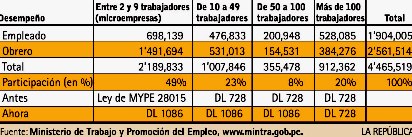 Pero el DL 1086 ha ido más allá, pues ahora es pequeña empresa la que tiene hasta 100 trabajadores, lo que incluye a 355,478 trabajadores de las empresas de 50 a 100 trabajadores, que se incluyen dentro del régimen de 14 sueldos por año.