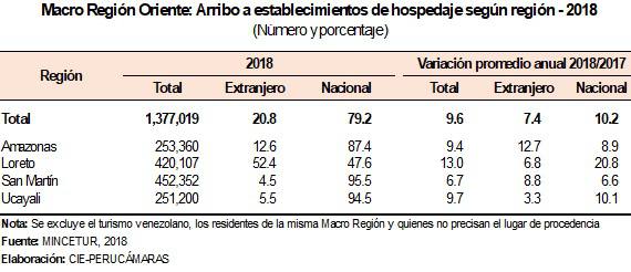 La Macro Región Oriente registró 1’337,019 arribos de turistas nacionales y extranjeros en el 2018, lo que representó un incremento de 9,6% con relación al 2017, según un informe del Centro de Investigación Empresarial (CIE) de PERUCÁMARAS.